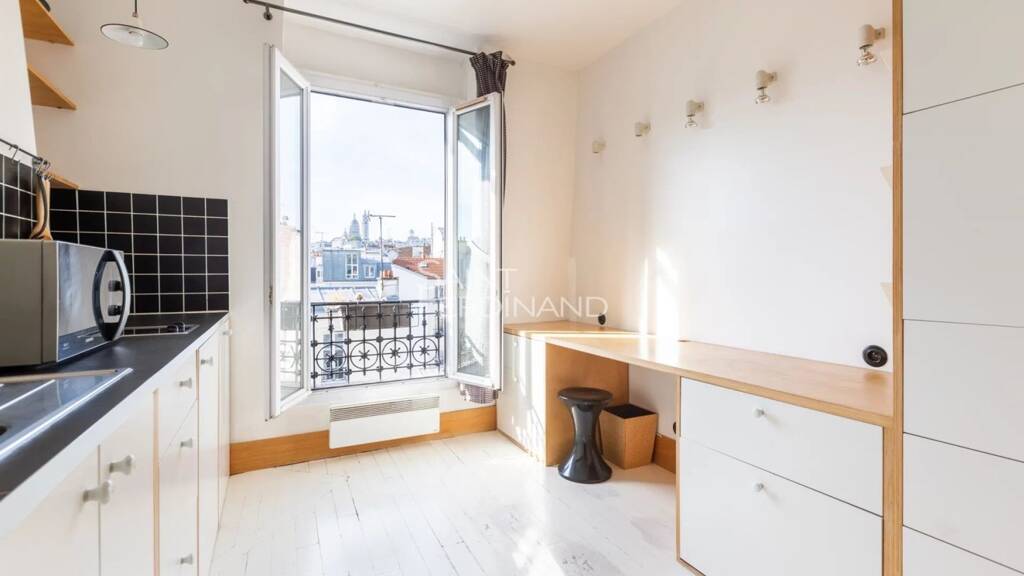 Exclusivité coup de coeur Au 6eme étage sans ascenseur d'une petite copropriété, le groupe Saint Ferdinand Immobilier a le plaisir de vous présenter ce magnifique deux pièces de 26 m2 avec vue sur le Sacré Coeur. Ensoleillé et traversant, Sud Ouest / Nord Est, ce petit bijou a été refait par un architecte avec le souci d'optimiser l'espace et les rangements. Le séjour avec cuisine ouverte et banquette pour déjeuner offre de nombreux rangements sur mesure qui se prolongent en bureau pour le télétravail. Une douche spacieuse en mosaïque s'ouvre sur la chambre tandis que les WC restent indépendants dans l'entrée. Une buanderie (non comprise dans la loi Carrez) est aménagée sur le palier intermédiaire. DPE G - Passage en E très facile avec clim réversible et accord de la copropriété déjà obtenu. Estimation des coûts annuels entre 1186€ et 1604€. Les informations sur les risques auxquels ce bien est exposé sont disponibles sur le site Géorisques